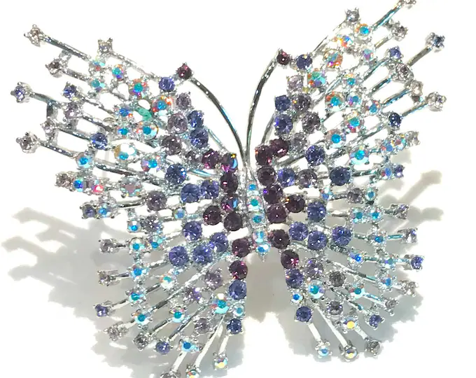 This elegant vintage Nolan Miller butterfly brooch features a radiant array of shimmering crystals in soft lavender, icy blue, and clear tones, set in a silver-tone metal. Intricately designed to resemble delicate butterfly wings, it adds a timeless touch of glamour to any outfit.